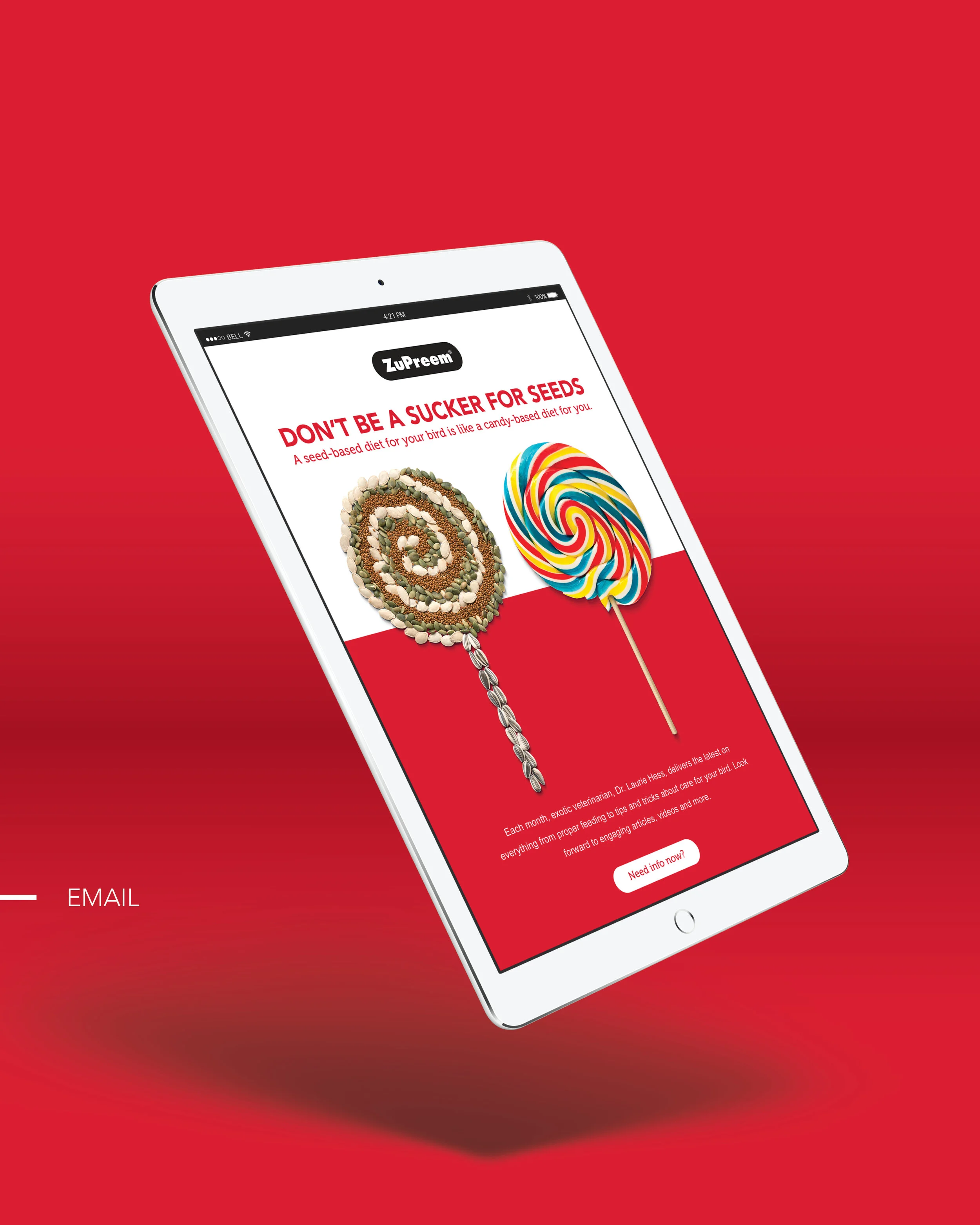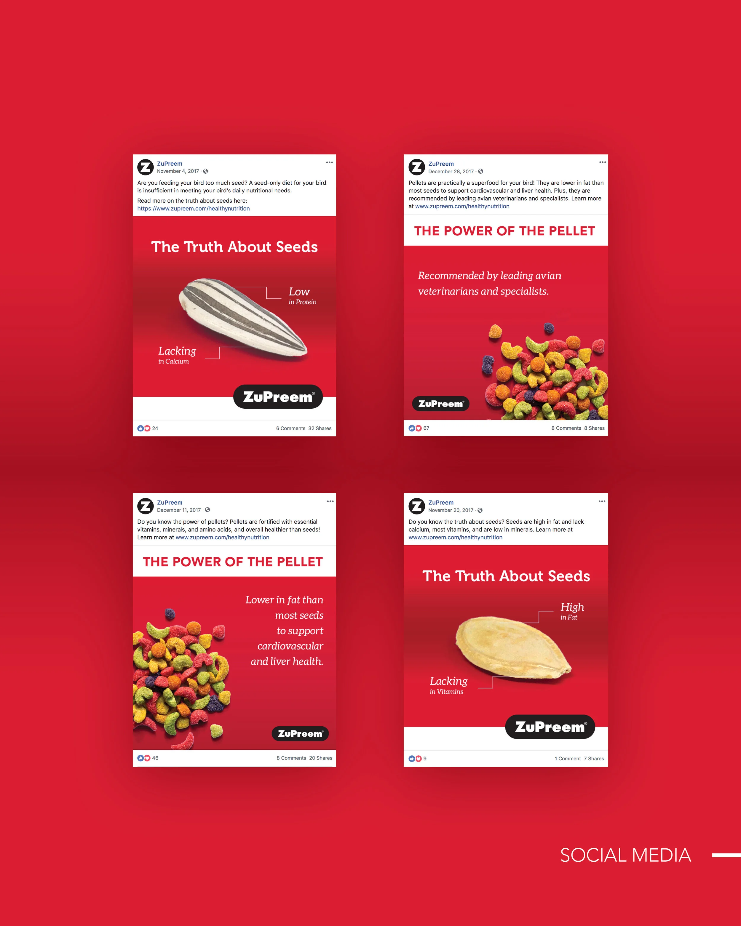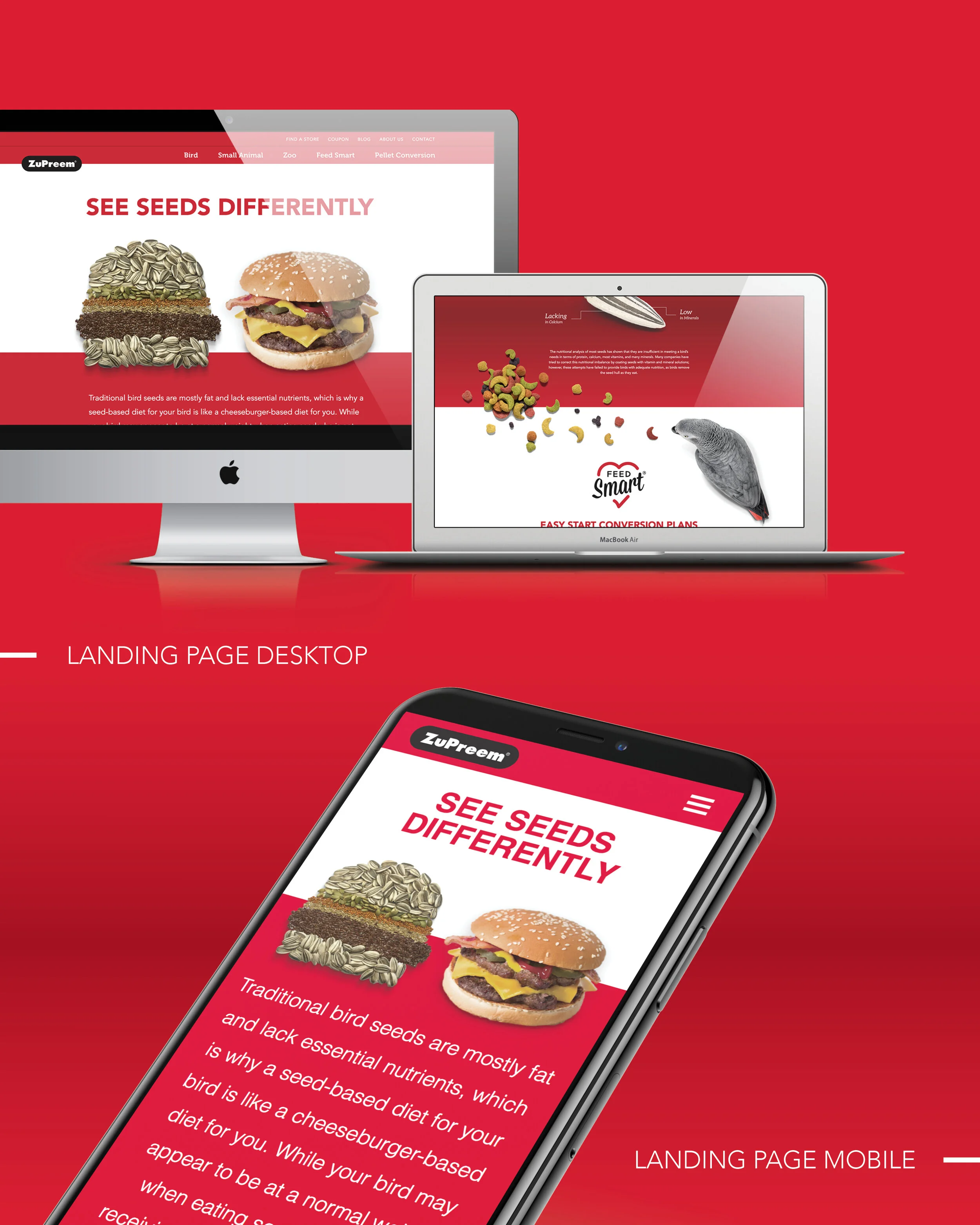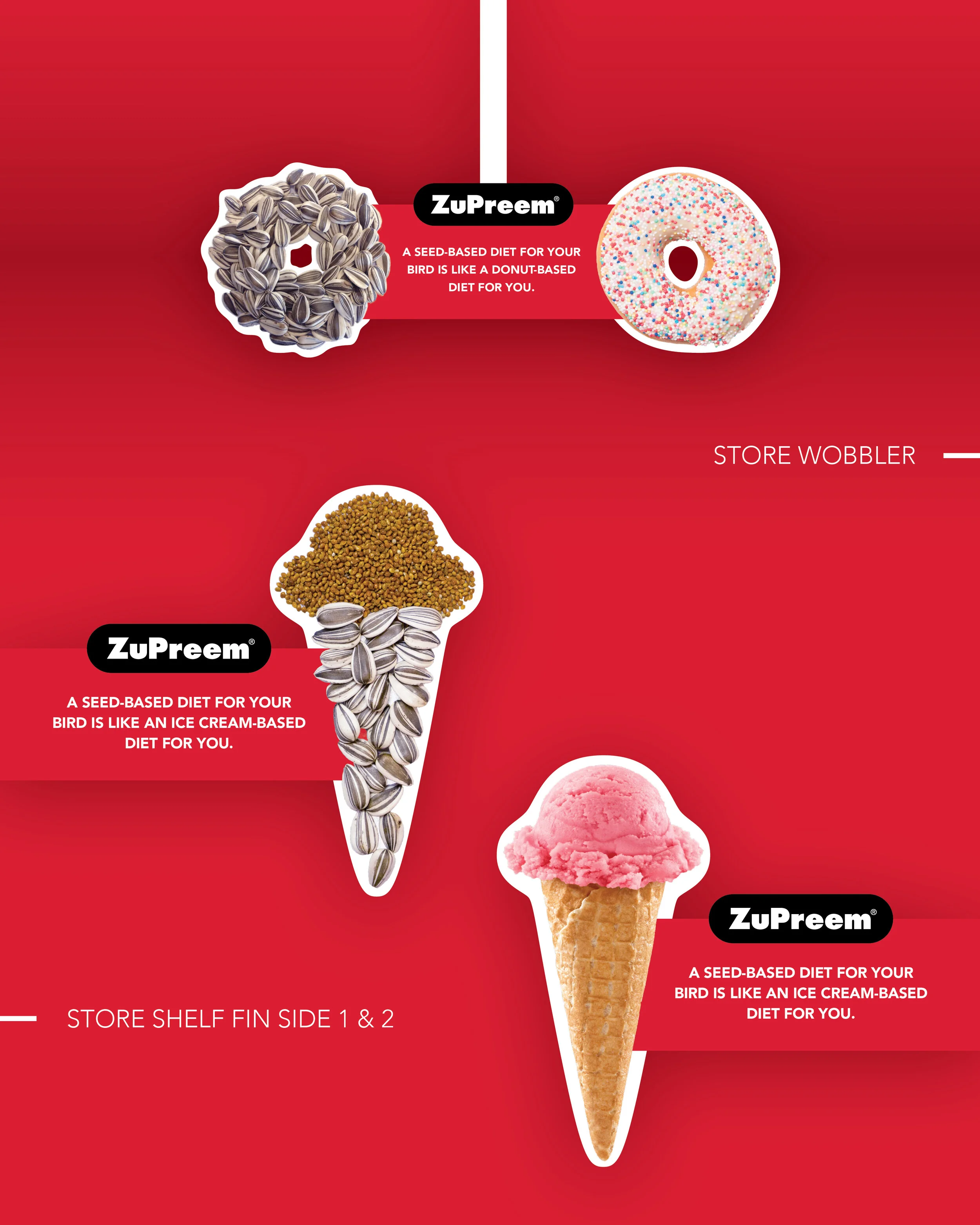 ZuPreem, a manufacturing company for zoo animal and specialty pet food, tasked us with educating bird owners that overconsumption of seeds is unhealthy for birds. We created a BSA—Bird Service Announcement—complete with simple seed art metaphors and compelling copy to get the job done.